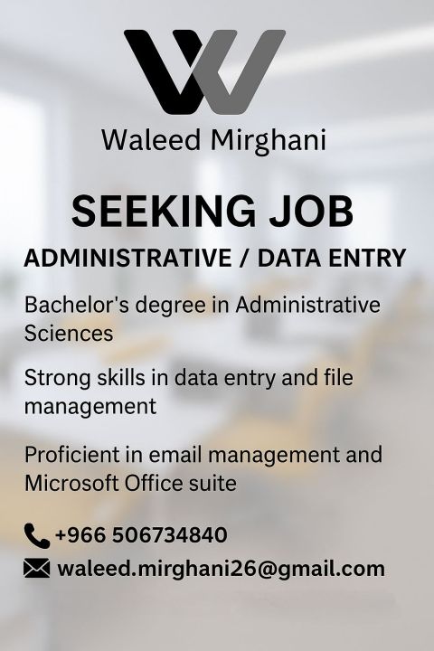 ابحث عن فرصة عمل مناسبة في مجال اداري أو مكتبي، حيث أحمل درجة البكالوريوس في هندسة الاتصالات، بالاضافة الى دبلوم في المحاسبة واللغة الانجليزية. لدي خبرة عملية تتجاوز السنتين، وأتمتع بمهارات متقدمة في الحاسب الآلي، وإدارة الوقت، والعمل بروح الفريق، والتواصل الفعال. أطمح للانضمام الى جهة رائدة تقدر الطموح وتوفر بيئة مهنية محفزة تتيح التطوير والنمو المستمر. مقر الإقامة الرياض