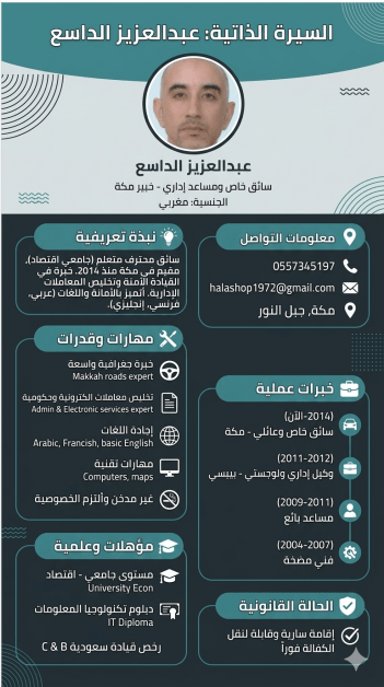 سائق خاص مغربي (جامعي) خبير في مكة - جاهز لنقل الكفالة، أنا سائق خاص من الجنسية المغربية، مقيم في مكة المكرمة منذ عام 2014، ابحث عن عمل لدى عائلة كريمة. أهم المميزات خبير بطرق مكة حافظ لجميع الأحياء (العوالي، الشوقية، بطحاء قريش، النسيم) والطرق البديلة لتفادي الزحام. خلفية جامعية متعلم (تخصص اقتصاد) وأجيد المهام الادارية وتخليص المعاملات الالكترونية