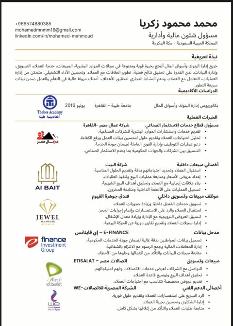 أحمد عاطف محمد حسين / التعليم بكالوريوس محاسبه / الخبرات الوظيفيه محاسب بفنادق سياحية المهارات - مايكروسوفت أوفيس) وورد اكسل أكسس، أوتلوك، بوربوينت) استخدام برامج المحاسبة إدارة الوقت - العمل الجماعي التفكير النقدي القيادة إدارة المشاريع - العلاقات العامة سريع التعلم الإقامة سارية لمدة عام