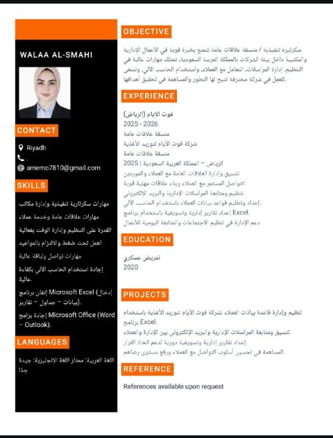باحثة عن عمل - سكرتيرة تنفيذية / منسقة علاقات عامة - مصرية ابحث عن عمل مناسب في مجال السكرتارية التنفيذية أو العلاقات العامة أو الأعمال الادارية. لدي خبرة في إدارة المكاتب وتنظيم العمل الاداري - التعامل مع العملاء وبناء علاقات مهنية - تنظيم الاجتماعات والمراسلات الادارية - اعداد التقارير وإدارة قواعد البيانات - استخدام برامج Microsoft Office وExcel باحتراف أتميز ب مهارات تواصل قوية