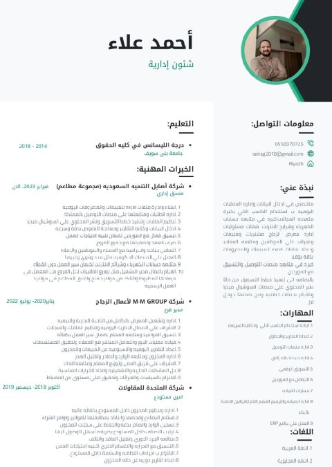 أنا حاصل علي كلية حقوق جامع الزقازيق ابحث عن عمل في مجال الادارات والشركات. اشتغلت محامي حر لمدة ثلاث سنوات. عضو لدي اتحاد المحامين العرب. عضو لدي نقابة المحامين المصرية. اشتغلت في ادارة الشؤون قانونية مصنع المحمدي للملابس. واشتغلت أمين خزينة في شركة هاما للصناعات الطبيعية الغذائية. واشتغلت مساعد محاسب عام. واشتغلت مدخل بيانات لدي مجموعة صيدليات طيبة