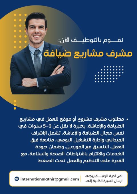 مطلوب مشرف مشروع أو موقع للعمل في مشاريع الضيافة والاعاشة، بخبرة لا تقل عن 5 سنوات في نفس مجال الضيافة والاعاشة، تشمل الاشراف الميداني وإدارة التشغيل اليومي، متابعة فرق العمل، التنسيق مع الموردين، وضمان جودة الخدمات والالتزام باشتراطات الصحة والسلامة، يفضل من معه شهادات مهنية. العمل بحي الملز في الرياض