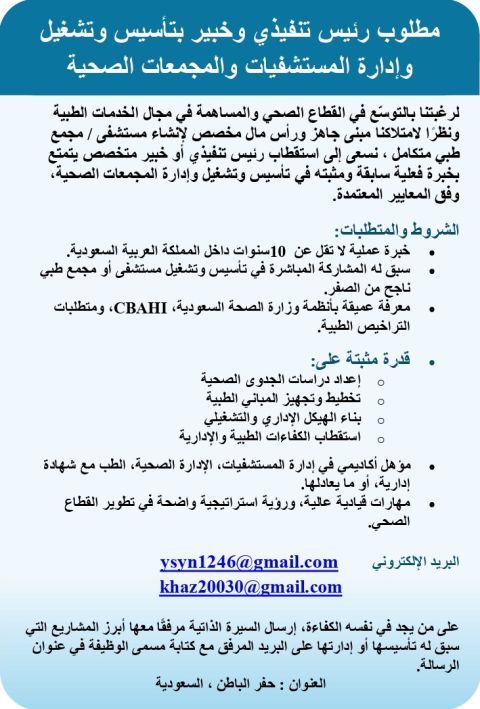 مشروع مستشفى / مجمع طبي متكامل في المملكة العربية السعودية، حفر الباطن، الربوة، يطلب رئيس تنفيذي متخصص يتمتع بخبرة فعلية سابقة ومثبته في تأسيس وتشغيل وإدارة المجمعات الصحية. الشروط خبرة عملية لا تقل عن 10 سنوات في السعودية سبق له المشاركة في تأسيس مستشفى من الصفر معرفة بأنظمة وزارة الصحة، CBAHI، والتراخيص الطبية اعداد دراسات الجدوى الصحية - تخطيط وتجهيز المباني الطبية - بناء الهيكل الاداري والتشغيلي