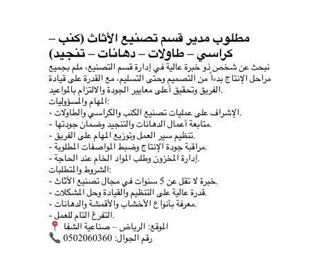 مطلوب مدير قسم تصنيع الأثاث (كنب - كراسي - طاولات - دهانات - تنجيد) نبحث عن شخص ذو خبرة عالية في إدارة قسم التصنيع، ملم بجميع مراحل الانتاج بدءا من التصميم وحتى التسليم، مع القدرة على قيادة الفريق وتحقيق أعلى معايير الجودة والالتزام بالمواعيد، الرياض صناعية الشفا للتواصل
