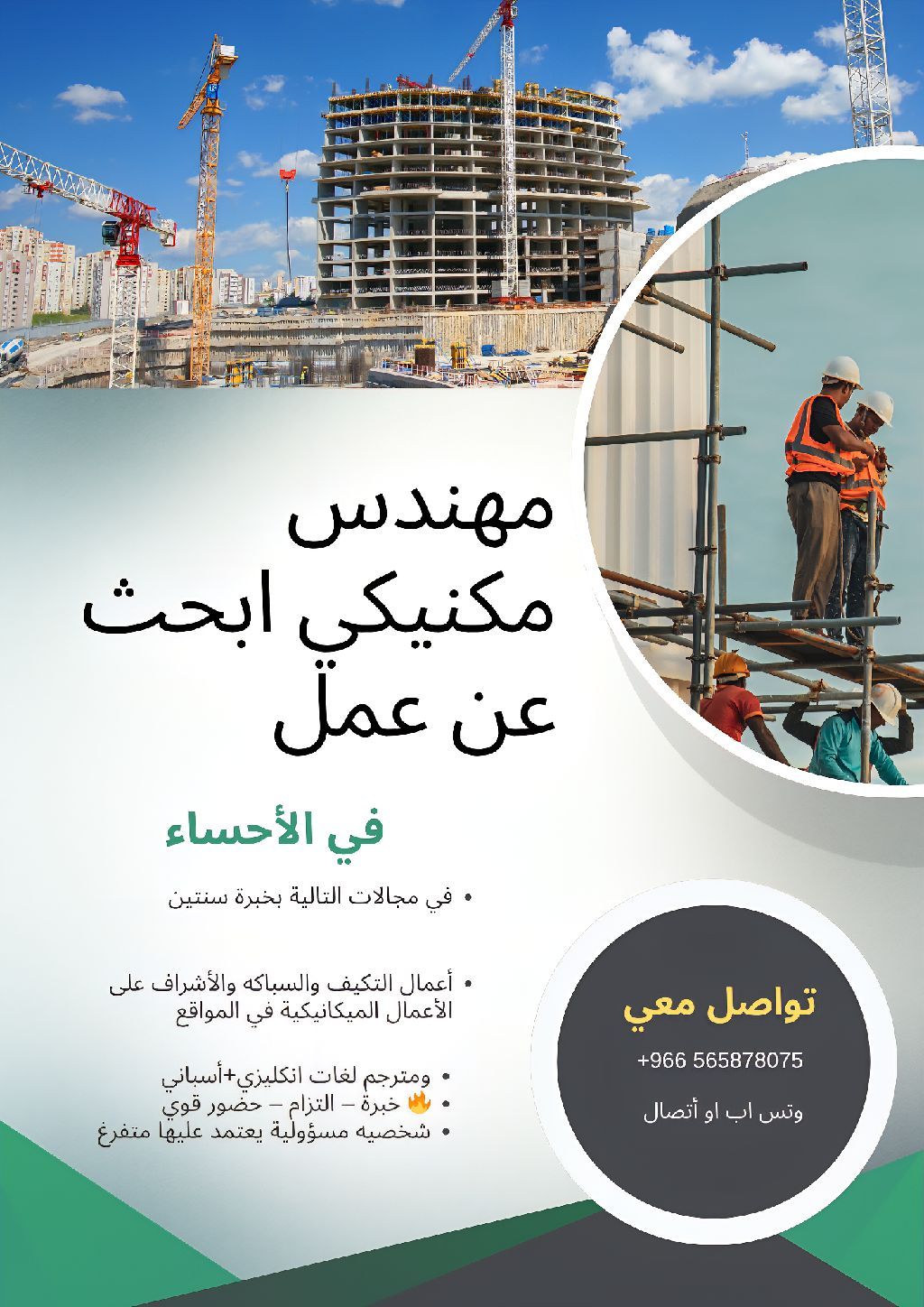 فرصة لأصحاب العمل في الاحساء شاب سوري موجود ب زيارة "وجاهز يثبت كفاءاته من أول يوم في مجال أعمال التكيف والسباكه والاشراف على الأعمال الميكانيكية في المواقع مترجم لغات الإسبانية + الانكليزية خبرة - التزام - حضور قوي شخصية مسؤولة يعتمد عليها، متفرغ وجاهز مباشرة متواجد في الاحساء - مستعد للعمل بأي مكان داخل المنطقة للتواصل واتساب أو اتصال مباشر