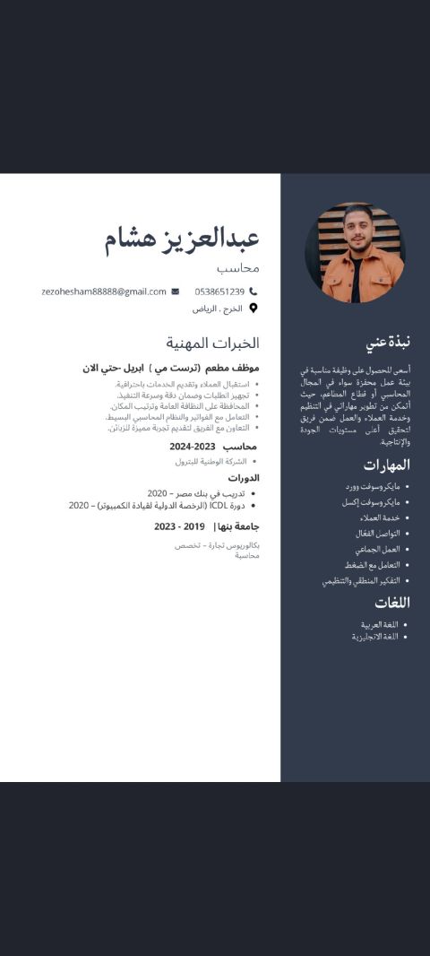 حاصل علي بكالوريوس تجارة قسم محاسبة، خبرة 3 سنوات في المحاسبة وادخال البيانات وجميع البرامج المحاسبية excel وodooo خبرة موظف الاستقبال متواجد داخل المملكة ومتاح إقامة سنة سارية للنقل