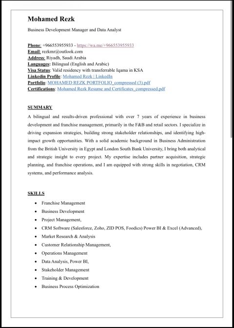 امتلك خبرة قوية في تطوير الأعمال، إدارة الامتياز التجاري، ورفع كفاءة العمليات في قطاع المطاعم والخدمات. عملت على قيادة مشاريع توسع، دراسة الأسواق، اعداد خطط تشغيل وتسويق توقيع عقود امتياز، وتحسين أداء الفروع لرفع المبيعات وضمان الجودة. لدي مهارات في التواصل مع المستثمرين، إدارة العلاقات، وتحليل البيانات لدعم اتخاذ القرار. متاح لأدوار تطوير الأعمال، إدارة الامتياز، التوسع والعمليات. للتواصل