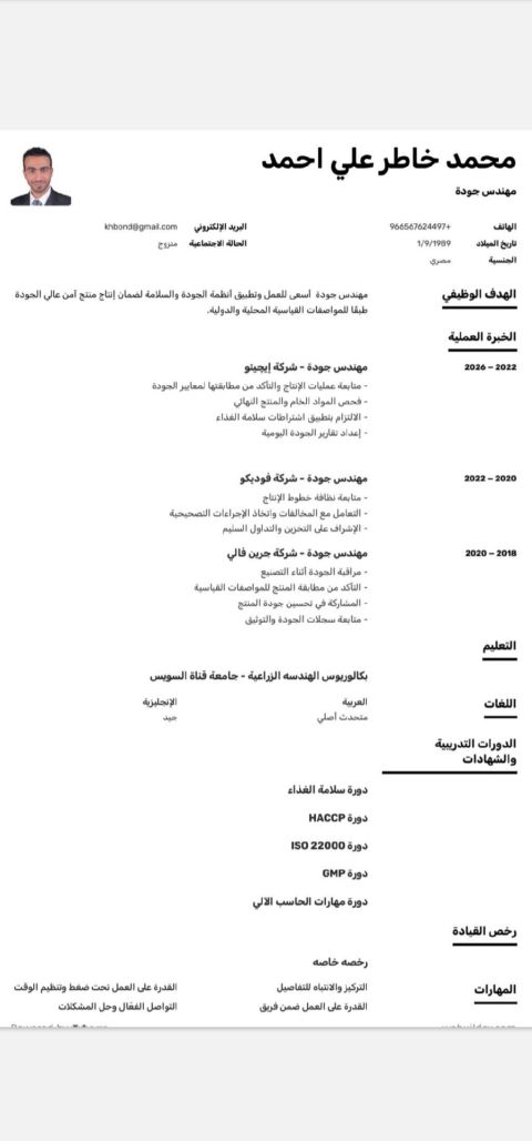 مشرف جودة بخبرة 9 سنوات في قطاع الصناعات الغذائية، متخصص في مصانع الخضار، السناكس، والبطاطس نصف المقلية. لدي خبرة عملية في تطبيق أنظمة إدارة الجودة وسلامة الغذاء (HACCP - GMP - ISO) ومتابعة العمليات الانتاجية، وضبط جودة المنتج النهائي، وإجراء التفتيش الدوري وتحليل أسباب المشكلات واتخاذ الاجراءات التصحيحية. أتميز بالدقة، وتحمل ضغط العمل، والقدرة على قيادة فريق الجودة لتحقيق أعلى معايير السلامة