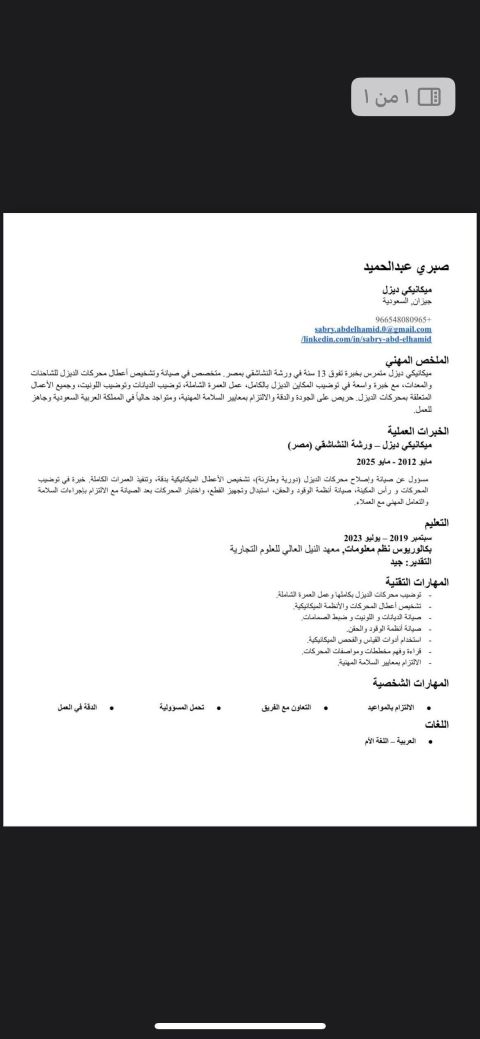 مسؤول صيانة عن السيارات والمعدات وعندي خبرة في مجال الميكانيكي 13 عام ومعي بكالوريوس نظم ومعلومات ادارية