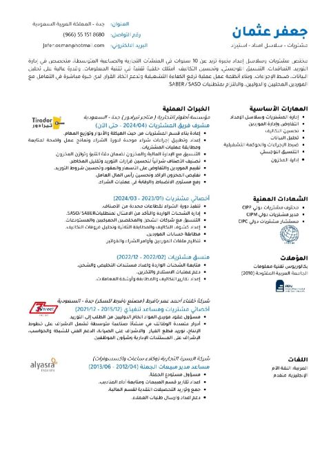 مختص مشتريات وسلاسل إمداد بخبرة تزيد عن 10 سنوات في المنشاءات التجارية والصناعية المتوسطة، متخصص في إدارة التوريد، التعاقد، التنسيق اللوجستي، وتحسين التكاليف خبرة عملية في اعادة بناء أقسام المشتريات، ضبط الاجراءات، إدارة الموردين المحليين والدوليين، والامتثال لمتطلبات SABER / SASO