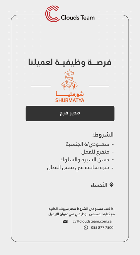 مطلوب مدير فرع لشورمتيا الاحساء (الهفوف) لا يشترط جنسية محدده