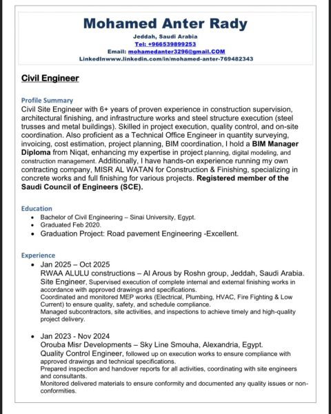 مهندس مدني بخبرة عملية تمتد لأكثر من 6 سنوات في تنفيذ وإدارة المشاريع الانشائية، اعمل بكفاءة عالية ك مهندس موقع ومهندس مكتب فني في تنفيذ جميع أعمال العظم، التشطيبات، والبنية التحتية الاشراف الفني وضبط الجودة بالموقع، حصر الكميات - التسعير - اعداد المستخلصات، اعداد ومراجعة Shop Drawings، متمكن من العمل علي AutoCAD، Revit، Primavera، ASD، معتمد من الهيئة السعودية للمهندسين - رخصة قيادة سارية - جاهز