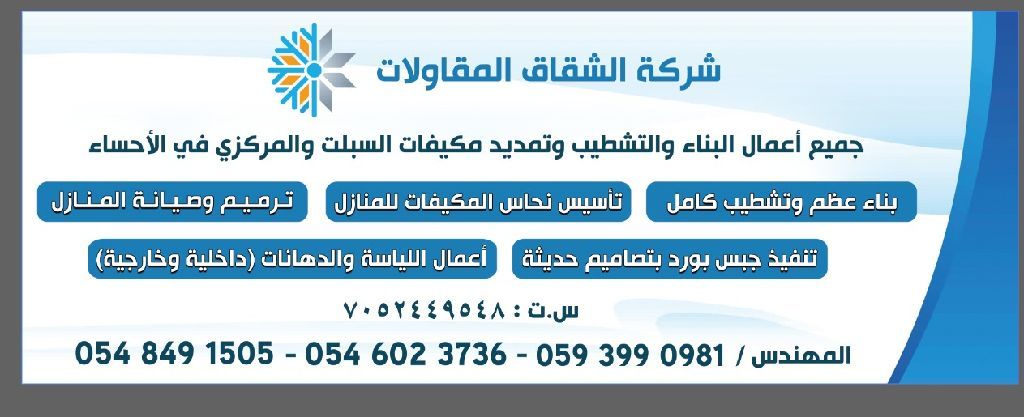تعلن شركة الشقاق للمقاولات عن أعمال صيانة وتركيب المكيفات وعن أعمال الصيانة العامة والتأسيس والتشطيب بأسعار مناسبة للاستفسار التواصل علي رقم