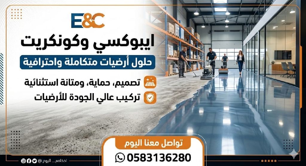 عالم الأرضيات المتكاملة إيبوكسي وكونكريت هل تبحث عن أرضية تجمع بين الفخامة، المتانة، واللمعان نحن نوفر لك أفضل حلول الأرضيات الحديثة للمنازل، المستودعات، والمعارض خدماتنا المتميزة أرضيات إيبوكسي (Epoxy) الوان عصرية، مقاومة للزيوت والبكتريا، وسهلة التنظيف. كونكريت قوة تحمل فائقة وتصاميم هندسية رائعة للممرات والساحات. ترميم وحماية معالجة الشقوق وتجديد الأرضيات الخ