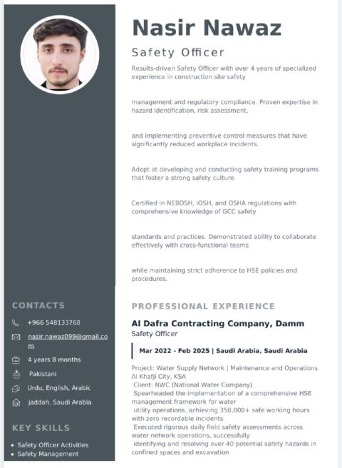 NEBOSH - certified Safety Officer with 5 + years KSA experienceexpert in site inspections, hazard control, risk assessment, and maintaining safe project operations. Ready to join immediately
