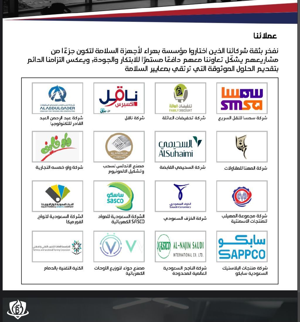 مؤسسة بهراء لاجهزة السلامة معتمدة لدى الدفاع المدني عقود صيانة لأنظمة مكافحة الحريق توريد وتركيب اجهزة الانذار واجهزة الاطفاء اصدار شهادات السلامة والتقرير الفني متخصصون في كافة أنظمة المضخات UL & Non Ul تجديد جميع أنواع الطفايات (بدرة & co2 & رغوة) توريد وتركيب جميع اجهزة المراقبة مهندسين خبرة في مجال السلامة فنيون بكفاءة عالية فحص واختبار كل النظام عند تسليم المشاريع متواجدون في الدمام والشرقية