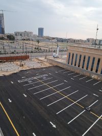 Planning asphalt roads, parking spaces, arrows, and signs for people with disabilities using hot thermoplastic materials and cold epoxy paints using the latest road spraying machines
