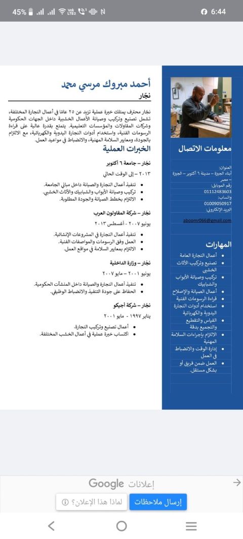 أنا نجار باب وشباك محترف من مصر التواصل مع الرقم الموجود في CV ابحث عن عمل في السعودية