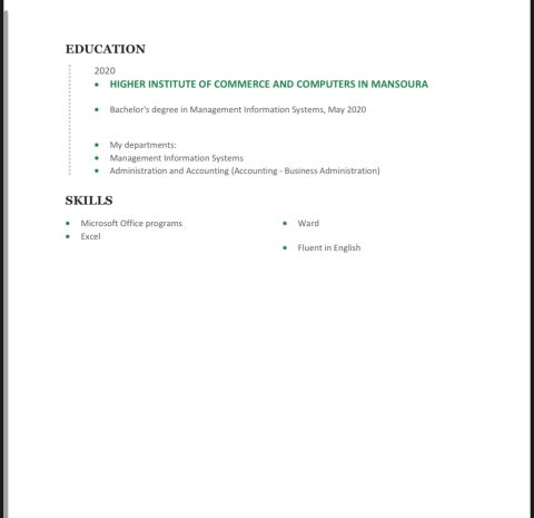 أنا خريج نظم معلومات ولدي خبرة كبيرة في مجالات الفنادق كموظف استقبال وخدمة عملاء ومدخل بيانات ولدي خبرة في الكثير من البرامج الحاسوب المتعددة