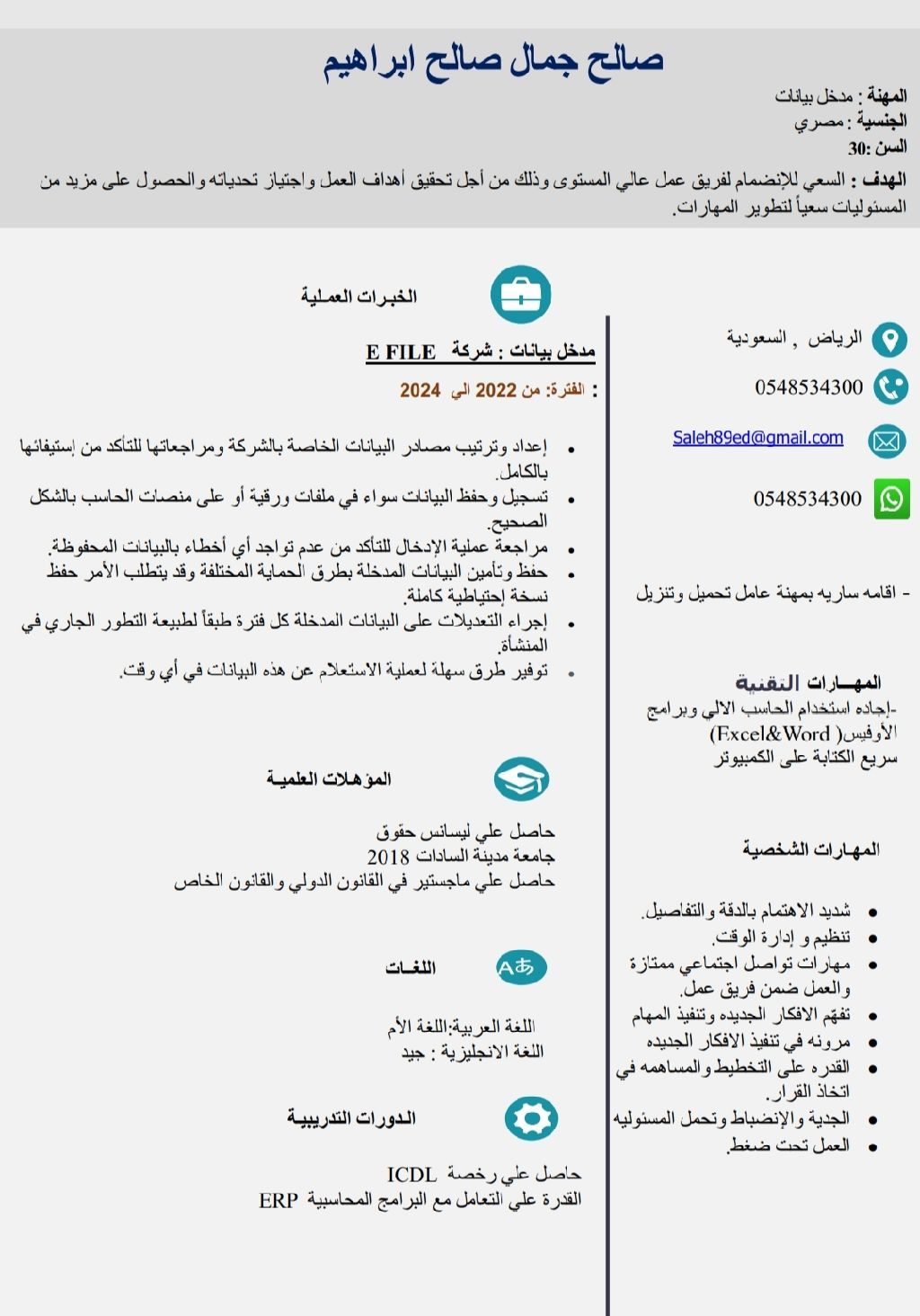 أنا صالح جمال الشويمى. أتقدم بالبحث عن فرصة عمل (مدخل بيانات) اشتغلت 6 شهور في جامعة نجران وقادر على أي شغل وفي أي مكان