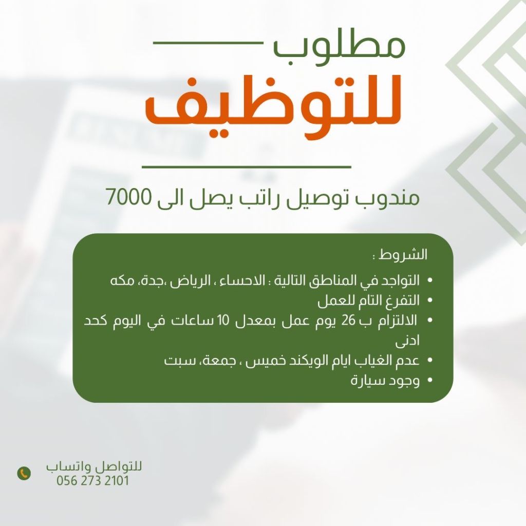 مندوب توصيل راتب يصل الى 7000 الشروط التواجد في المناطق التالية الاحساء، الرياض، جدة، مكة - مقر المكتب حي السلام - التفرغ التام للعمل - الالتزام ب 26 يوم عمل بمعدل 10 ساعات في اليوم كحد أدنى - عدم الغياب أيام الويك اند خميس، جمعة، سبت - وجود سيارة