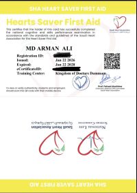 Experienced and professional Ambulance Driver with a valid Saudi Driving License (Saaq Sayyara profession) I have extensive experience working in Aramco Master Gas Projects and am certified by JHAH (Johns Hopkins Aramco Healthcare) standards. Valid BLS (Basic Life Support) First Aid Certification. Expert in Remote Site Operations and Emergency Response. HAZMAT Awareness Training certified