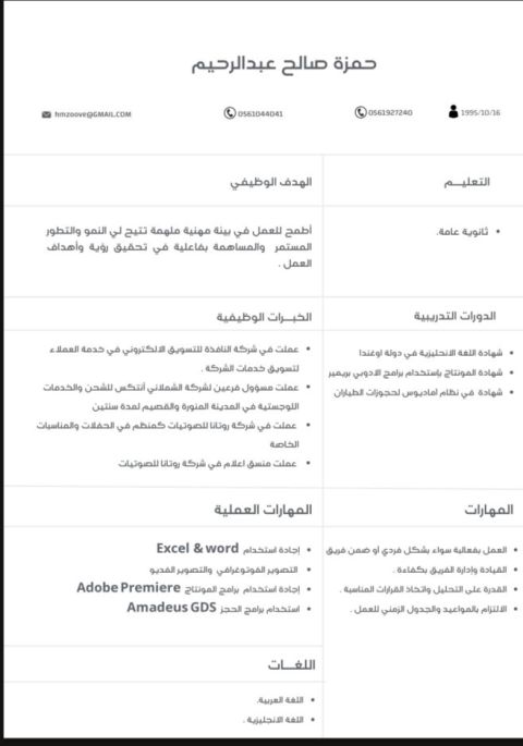 أنا حمزة صالح العمر 30 عملت سابقا في عدة مجالات في قطاع الشحن مدير فرع وأيضا في ادارة واشراف في الفعاليات الترفيهية في الرياض وفي شاطئ ارامكو الخبر وأيضا عملت في شؤكة تسويق لديه خبرة في ادخال البيانات والتعامل مع برامج الأوفيس والمونتاج متفرغ وجاهز للعمل في أي مكان أنا متواجد في المدينة المنورة وليس لديه أشكالية في العمل في أي منطقة يرجى الاتطلاع على سيرتي الذاتية