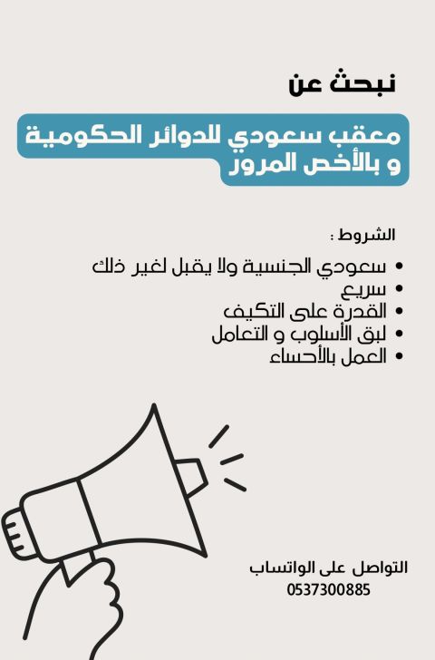 نبحث عن موظف بمسمى معقب للدوائر الحكومية وبالأخص المرور والشروط سعودي الجنسية ولا يقبل لغير ذلك - سريع - القدرة على التكيف - لبق الأسلوب والتعامل - العمل في مدينة الاحساء، المبرز، الهفوف