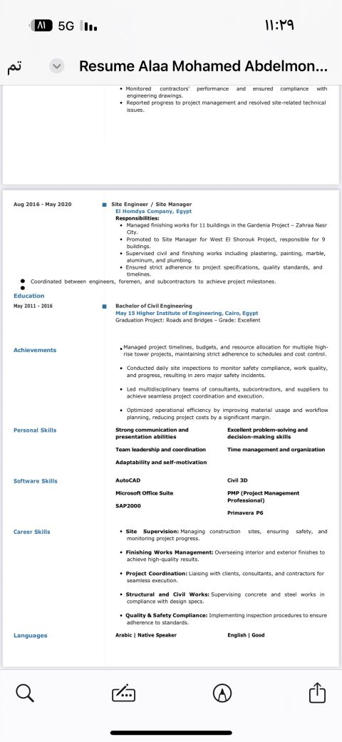 مهندس كهرباء خبرة أكثر من 7 سنوات في الاشراف والتنفيذ للأعمال الكهربائية في مشاريع الإنشاءات (الأبراج السكنية، الفنادق، والمنشاءات التعليمية) مع خبرة عملية في التشغيل والصيانة بعد التسليم. خبرة في أنظمة الجهد المنخفض LV أنظمة التيار الخفيف ELV (Fire Alarm - CCTV - Data - BMS) MDB - ATS - RMU اجادة برامج AutoCAD - ETAP - Revit متاح للعمل داخل المملكة