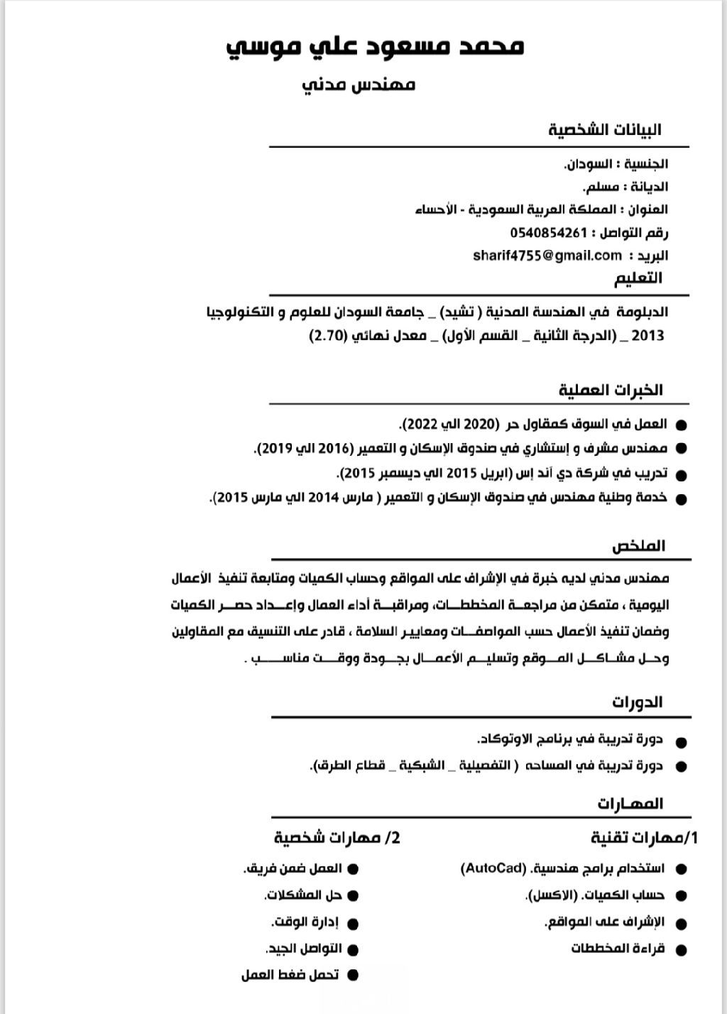 مهندس مدني سوداني خبرة أكثر من 10 سنوات في المشاريع والمقاولات العمر 30 سنة اشتغل على الأتوكاد والاشراف وحل المشاكل الهياكل التشطيبات خرط