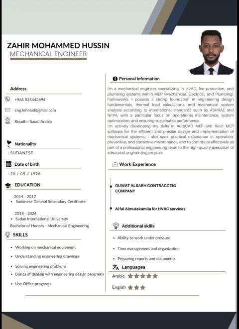 مهندس ميكانيكا حريق وانذار وتكييف وتبريد أو والصيانة أو صرف صحي اشراف وتنفيذ وخبرة من قبل سنتين في مجال الصيانة العامة وخطوط الانتاج وخبرة سنة في مجال التبريد. وتكييف وخبرة سنتين في مجال الانذار والحريق وخبرة ستة شهور في تركيب طاقة شمسية وخبرة ستة شهور في تصميم والصيانة المصاعد الكهربائية وكمان اشتغلت في مجال الاسمرات هوم أتكلم الانجليزية بطلاقة، المؤهل بكالوريوس هندسة ميكانيكية