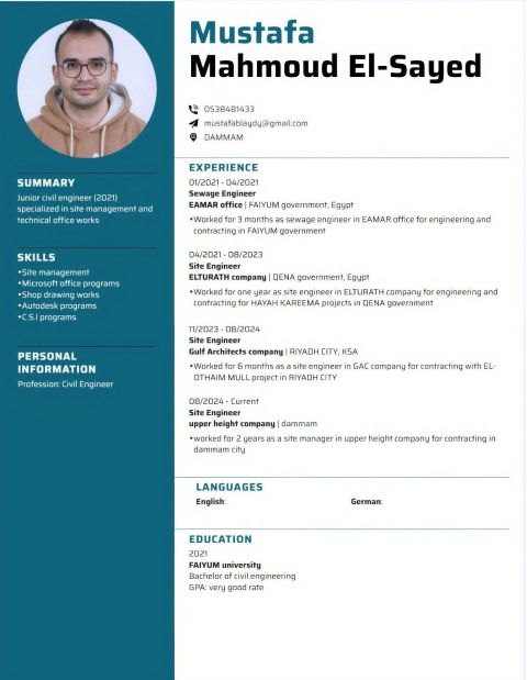 مهندس مدني 2021 خبرة 5 سنوات في الأعمال الميدانيه (الخرسانات والتشطيبات) سبق له العمل في المملكة (الرياض والدمام) خريج جامعة الفيوم (حكوميه)