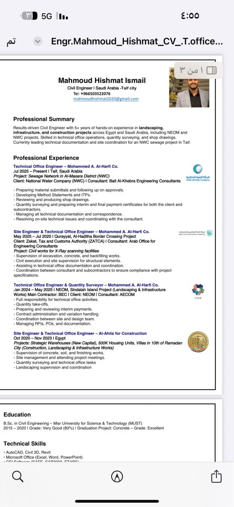 مهندس مكتب فني (Technical Office Engineer) أنا محمود حشمت، مهندس مكتب فني خبرة 5 سنوات في مشاريع البنية التحتية واللاند سكيب. أتقن جميع أعمال المكتب الفني بما في ذلك SHD، المستندات، RFIs، المواصفات، حساب الكميات، والفواتير، بالاضافة الى خبرة عملية بالموقع. عملت في مشاريع NEOM، واعمل حاليا في مشاريع NWC بمدينة الطائف. للتواصل