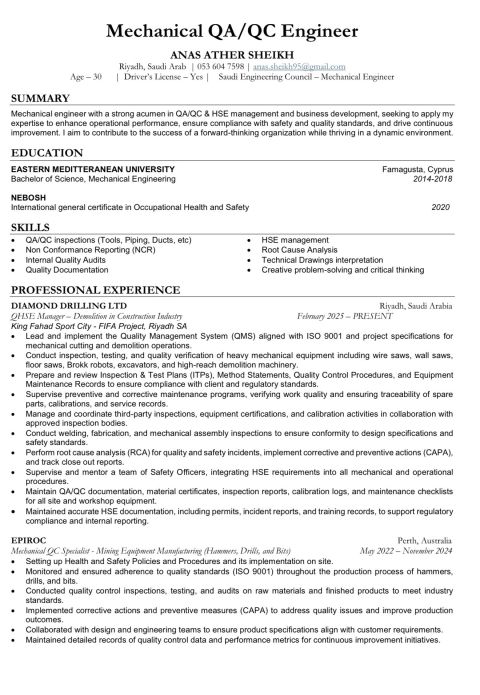 I am a mechanical engineer registered with Saudi Engineering Council with 8 years experience as QC mechanical engineer in the manufacturing and construction industry. Currently working as QHSE Manager. Looking to switch to Facilities Management or QC Mechanical Engineering. I can speak, read and write Arabic, English and Urdu