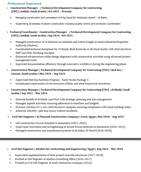 Senior Civil Engineer with + 10 years of experience in Construction civil works - Construction manager in Al - khafji project - Senior Civil Engineer in Facilities program Red Sea - Managed construction of 76 factories on schedule and within budget at Saudi Industrial Properties Authority (Modon) Coordinated technical disciplines for 76 Ready - Built Factories in the food cluster with steel structure