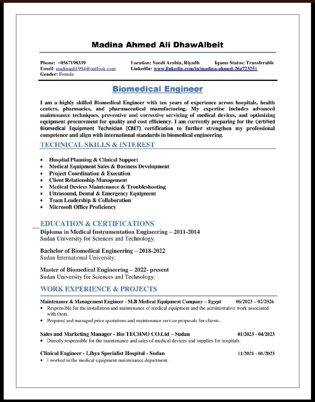 مهندسة اجهزة طبية بخبرة 8 سنوات في المبيعات الفنية وصيانة الاجهزة الطبية، خبرة في المستشفيات والمناقصات وخدمة ما بعد البيع. متاحة للعمل فورا في الرياض