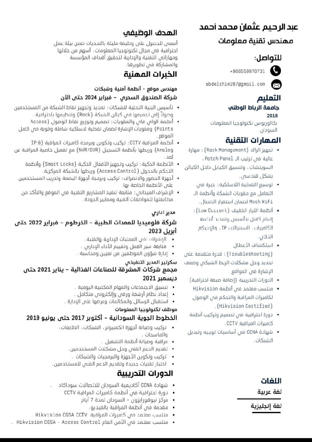 مهندس تقنية معلومات بخبرة عملية في تصميم وتنفيذ البنية التحتية للشبكات والأنظمة الأمنية كاميرات المراقبة معتمد منهيك (فجن) والسنترال تأسيس الشبكات من النقاط الى الراك ومقويات الشبكة والأقفال الذكية
