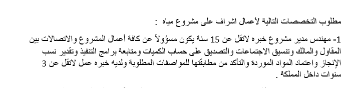 نقل فوري فقط، مطلوب مدير مشروع مجال مياه في المنطقة الشرقية في الاحساء حي البندرية للاشراف على مشروع أنابيب وصرف مياه وبنية تحتية خبرة عالية لا تقل عن 15 سنة كما هو موضح بالصورة