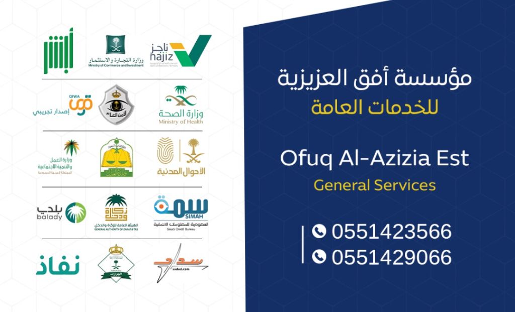 مكتب أفق العزيزية للخدمات العامة والحكومية نقدم لكم جميع الخدمات الحكومية والالكترونية في مكان واحد، وبطريقة منظمة وواضحة، مع متابعة دقيقة لكل معاملة حتى يتم اعتمادها رسميا من الجهة المختصة. نلتزم معكم ب السرعة - الدقة - المتابعة - الجودة. خدمات السجل التجاري ووزارة التجارة اصدار سجل تجاري جديد (رئيسي / فرعي) تجديد السجل التجاري الكتروانيا تعديل النشاط - تعديل العنوان - تعديل البيانات الغاء السجل التجاري