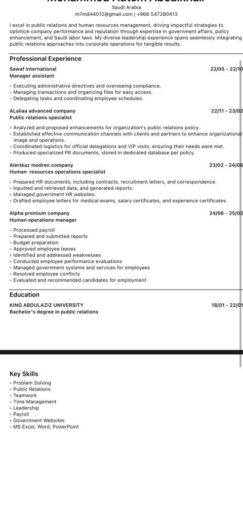 موظف موارد بشرية وعلاقات عامة وحكومية GRO. خبرة بالمواقع الحكومية مثل قوى ومدد ومقيم والتأمينات الاجتماعية وغيرها. عملت في متجر الكتروني مترجم ومسؤول لوجيستيك ومتابعة الطلبات ثم انتقلت بعدها لمكتب استقدام مترجم وعلاقات عامة بالاضافة الى شؤون الموظفين. انتقلت بعدها لشركة صيانة متخصص تسويق وموارد بشرية وبعدها عملت بشركة مقاولات مسؤول موارد بشرية وعلاقات حكومية