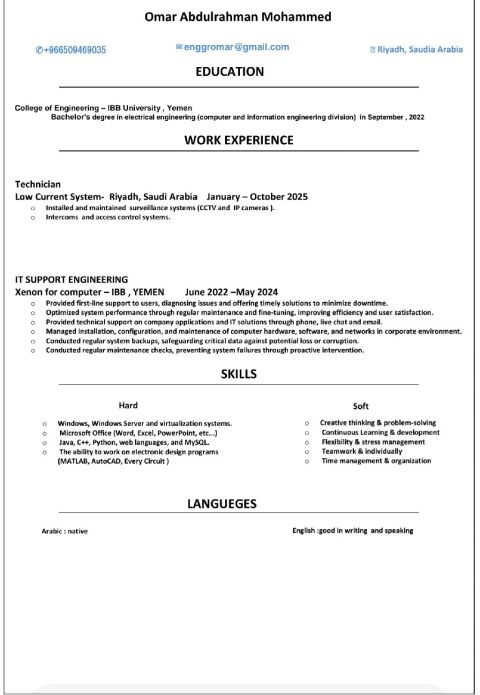 ابحث عن فرصة عمل في مجال تقنية المعلومات (IT support / Network Support/ Systems Administration) لدي خبرة أكثر من 7 سنوات في الدعم الفني، وإدارة الشبكات وصيانة اجهزة الحاسب، واجهزة البصمة وأنظمة المراقبة (CCTV) عملت سابقا في شركة Knowledge Technical Co. بمدينة جدة حيث قمت بتركيب وصيانة الأنظمة، وإدارة السيرفرات، وحل مشاكل المستخدمين عن بعد. امتلك مهارات قوية في إدارة أنظمة Windows Serv