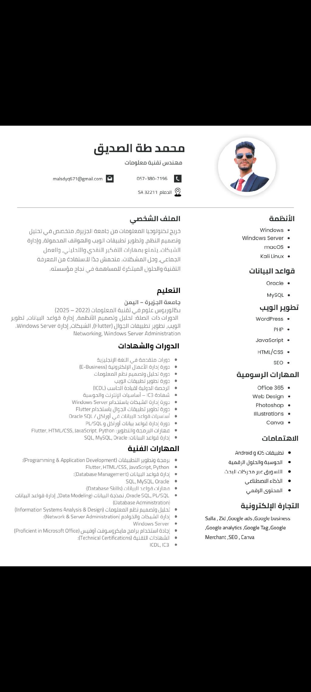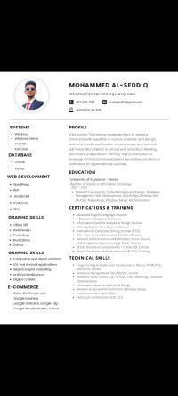 Information Technology graduate from Al Jazeera University with expertise in system analysis and design, web and mobile application development, and network administration. Skilled in critical and analytical thinking, teamwork, and problem - solving. Highly motivated to leverage technical knowledge and innovative solutions to contribute to organizational success
