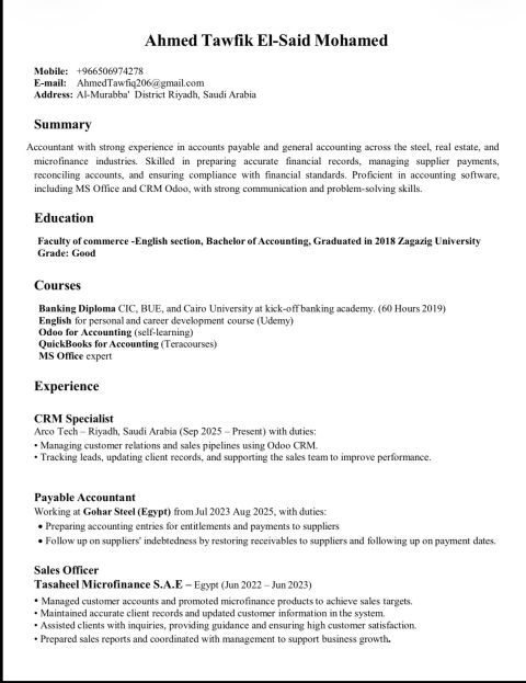 ابحث عن فرصة عمل في السعودية بمجال المحاسبة والمبيعات. خبرة في حسابات العملاء والموردين تسجيل القيود اليومية (مشتريات، مبيعات تسويات بنكية) واعداد التقارير المالية. أجيد التعامل مع أنظمة Odoo ERP Systems ولدي خبرة في المبيعات. متاح للعمل مع نقل الكفالة والتنقل بين المدن، ومقيم حاليا في الرياض
