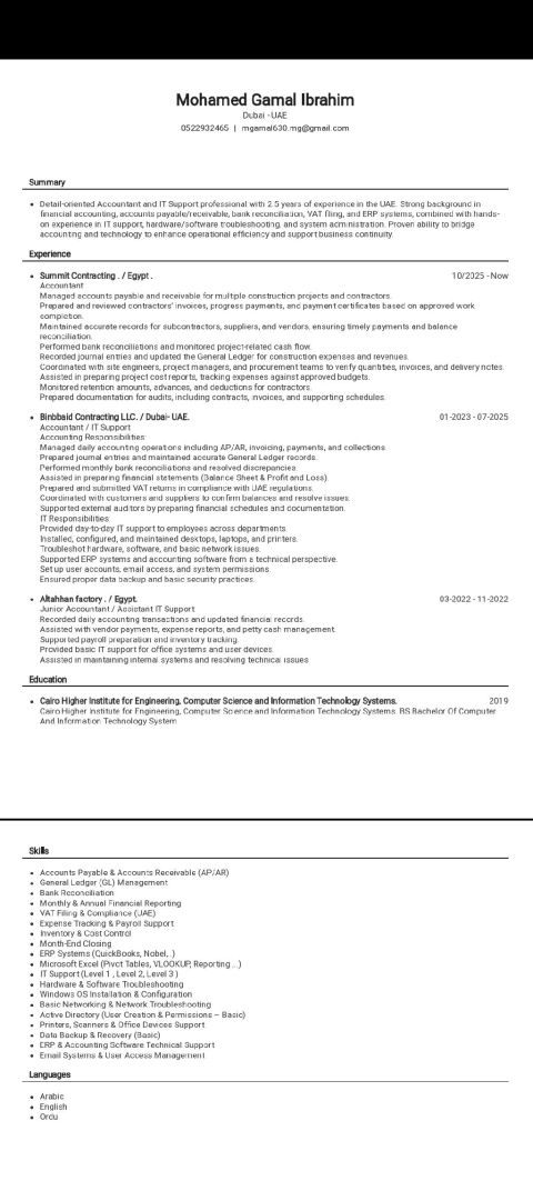 محاسب وأخصائي دعم تقني يتمتع بخبرة خمس سنوات، يتميز بدقة عالية في العمل. لديه خلفية قوية في المحاسبة المالية، وحسابات الدفع / القبض، ومطابقة الحسابات البنكية، وتقديم اقرارات ضريبة القيمة المضافة، وأنظمة تخطيط موارد المؤسسات (ERP) بالاضافة الى خبرة عملية في دعم تقنية المعلومات، واستكشاف أخطاء الاجهزة والبرامج وإصلاحها، وإدارة الأنظمة
