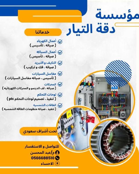 مؤسسة دقة التيار لجميع أعمال الصيانة خدماتنا الكهرباء - صيانة تأسيس فحص وتحديد مسار كيا بل ارتفاع فاتورة الكهرباء التماس كيا بل سباكه - صيانة تأسيس فحص تسريب ارتفاع فاتورة مياه تركيب كولشاور وفلاتر تكيف والتبريد - صيانة فك وتركيب تأسيس محركات - اصلاح دينمو المياه لف جميع المحركات الكهربائية مغاسل السيارات - صيانة. تأسيس تركيب لوحات التحكم