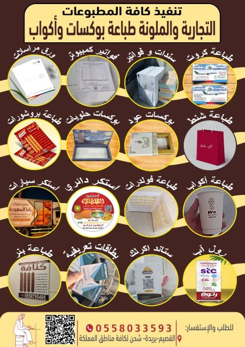 اذا كنت تبحث عن وكالة دعاية واعلان في القصيم أو مطبعة محترفة في بريدة، فأنت في المكان الصح تصميم وطباعة البنرات الاعلانية الداخلية والخارجية لجميع المناسبات تصميم وطباعة المطبوعات التجارية (فواتير كروت عمل، بروشورات، ملفات تعريفية) تصميم وتنفيذ الدروع التذكارية الفاخرة والهدايا المؤسسية تنفيذ جميع أنواع الأختام بسرعة ودقة عالي