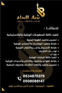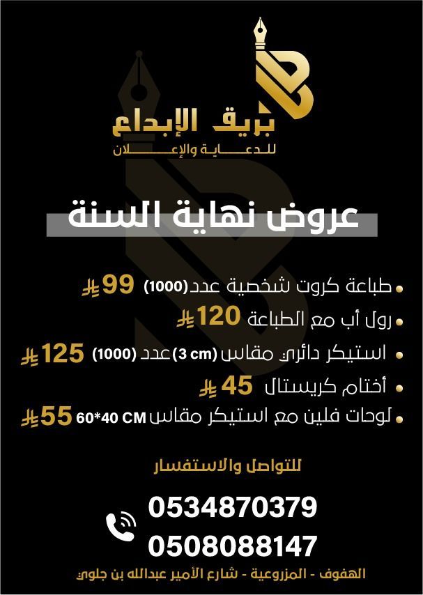 تصميم وتنفيذ جميع أنواع المطبوعات ستكر أختام ختم فولدرات كروت بروشورات فواتير بنر ستاند اكواب رول - أب أكياس بوكسات بروش ليبل - جلد ادرع قلم - ختم شمع ختم - تاريخ تطريز لايزر أحرف - بارزة لوحات - اعلانية أقلام شرائط سلك - سكرين - اكريليك