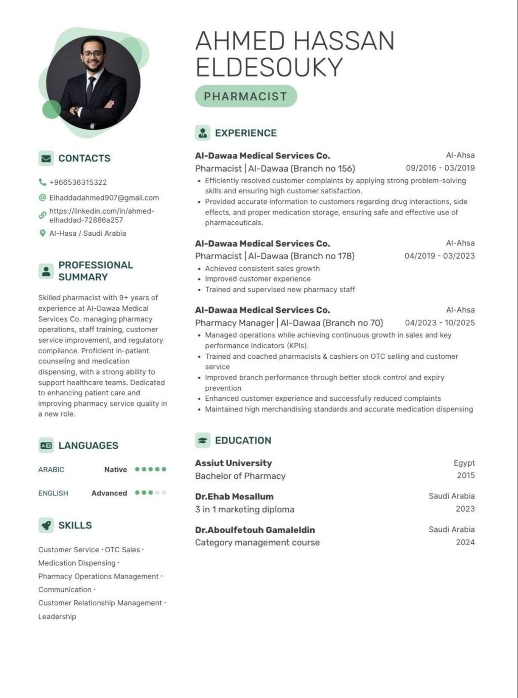 صيدلي خبرة 9 سنوات بصيدليات الدواء ترخيص ساري وإقامة سارية جاهز لنقل الكفالة في الاحساء
