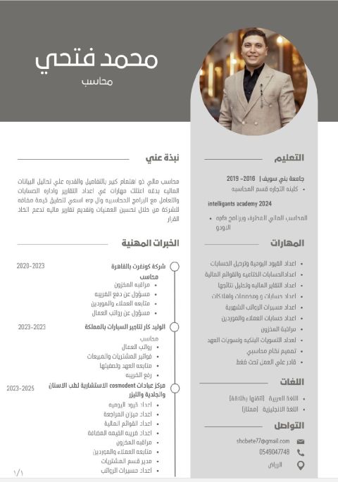 محاسب مصري خبرة 5 سنوات لدي القدرة على التعامل مع كافة البرامج المحاسبية وبرامج الأوفيس واعداد التقارير المالية والتسويات البنكية ومسيرات الرواتب ومتابعة العملاء والموردين ومتابعة المخزون وتقارير ضريبة القيمة المضافة ولدي خبرة في المجالات الطبية وفي شركات تأجير السيارات