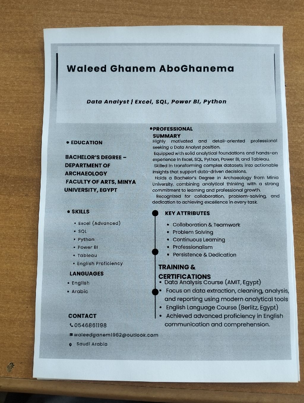 محلل بيانات باستخدام أهم الأدوات Power pi, Excel, SQL, Python, Tableau امتلك القدرة على قراءة البيانات وفهمها وتنظيفها واستخراج المطلوب منها وبناء Dashboard تفاعلية تستطيع أن تبني عليها قرارات وتستنبط منها أصل المشكلة وحلولها وتفادي نفس الأخطاء مستقبلا. أجيد الانجليزية بعد دراستها في معهد Birlltz